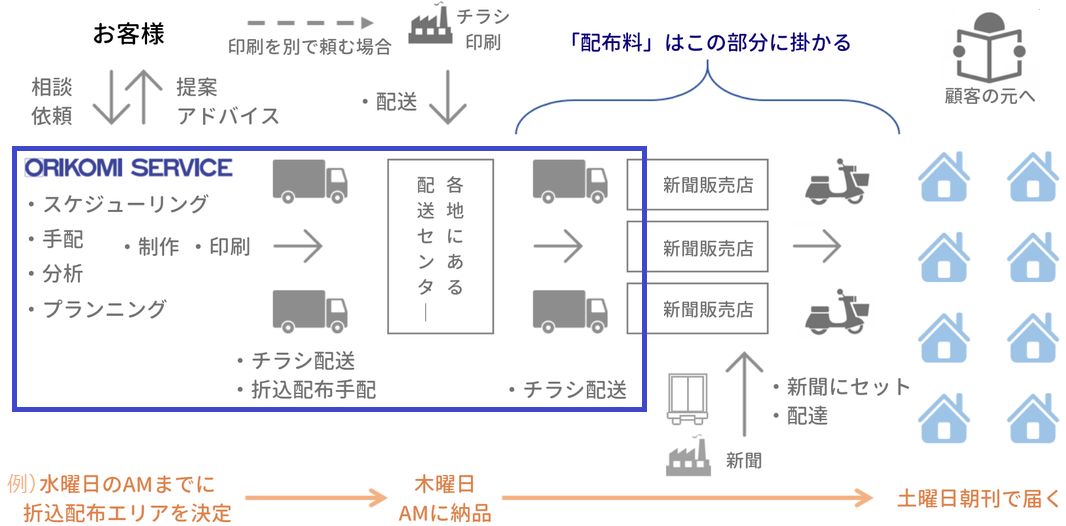 チラシがお手元にあれば、最短で1週間後に折込できます。原稿制作からお受けする場合には、配布の1か月前にはご相談いただく必要があります。
